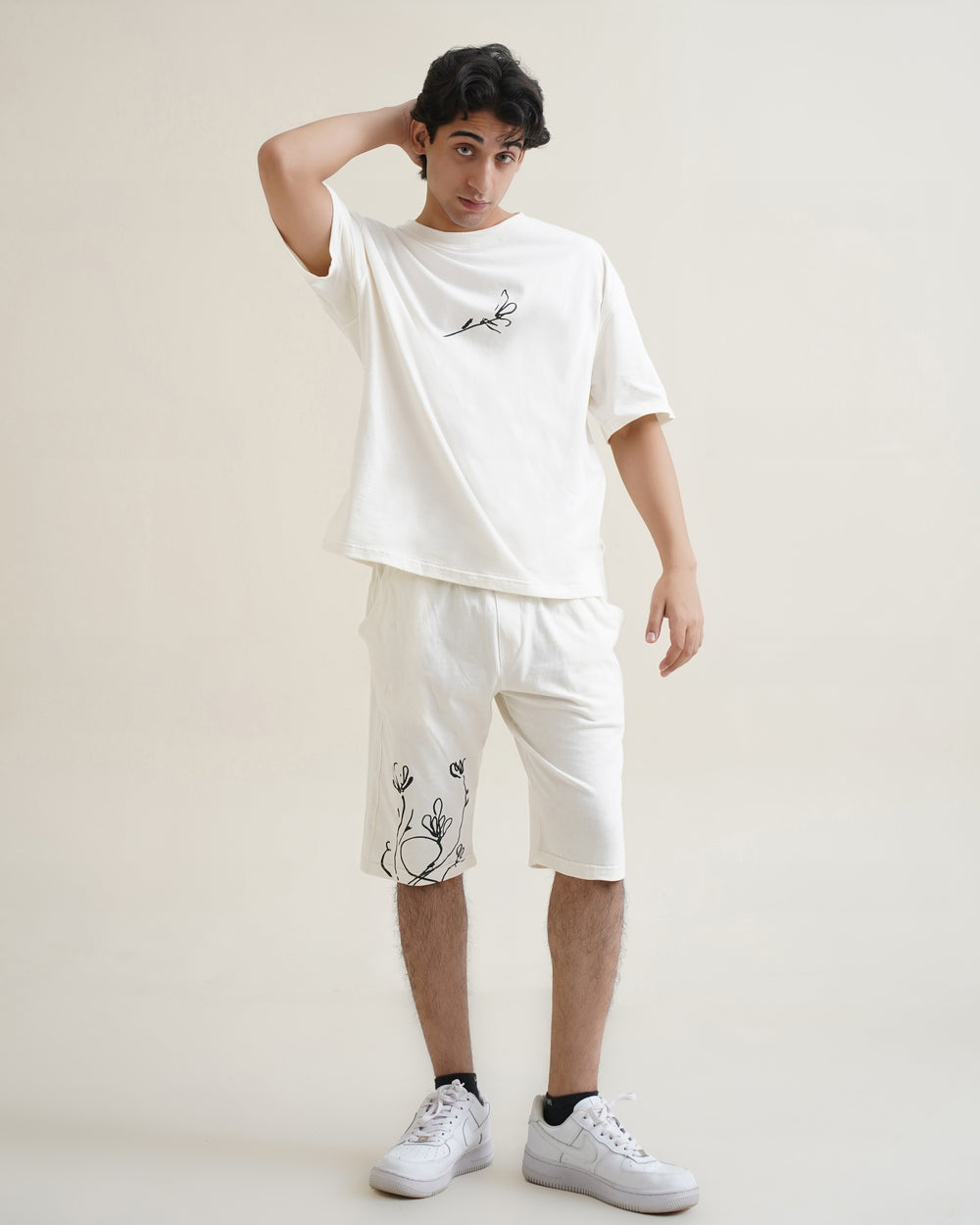 Stay cool and stylish in our Floral Line Art Co-Ord Set. This all off-white set is made from pure cotton and features a comfortable boxy fit tee and matching shorts. The hand-drawn floral graphic is subtly placed on the front and bold on the back of the tee, with a matching print on the shorts. Your go-to for comfort, art, and summer street style.
