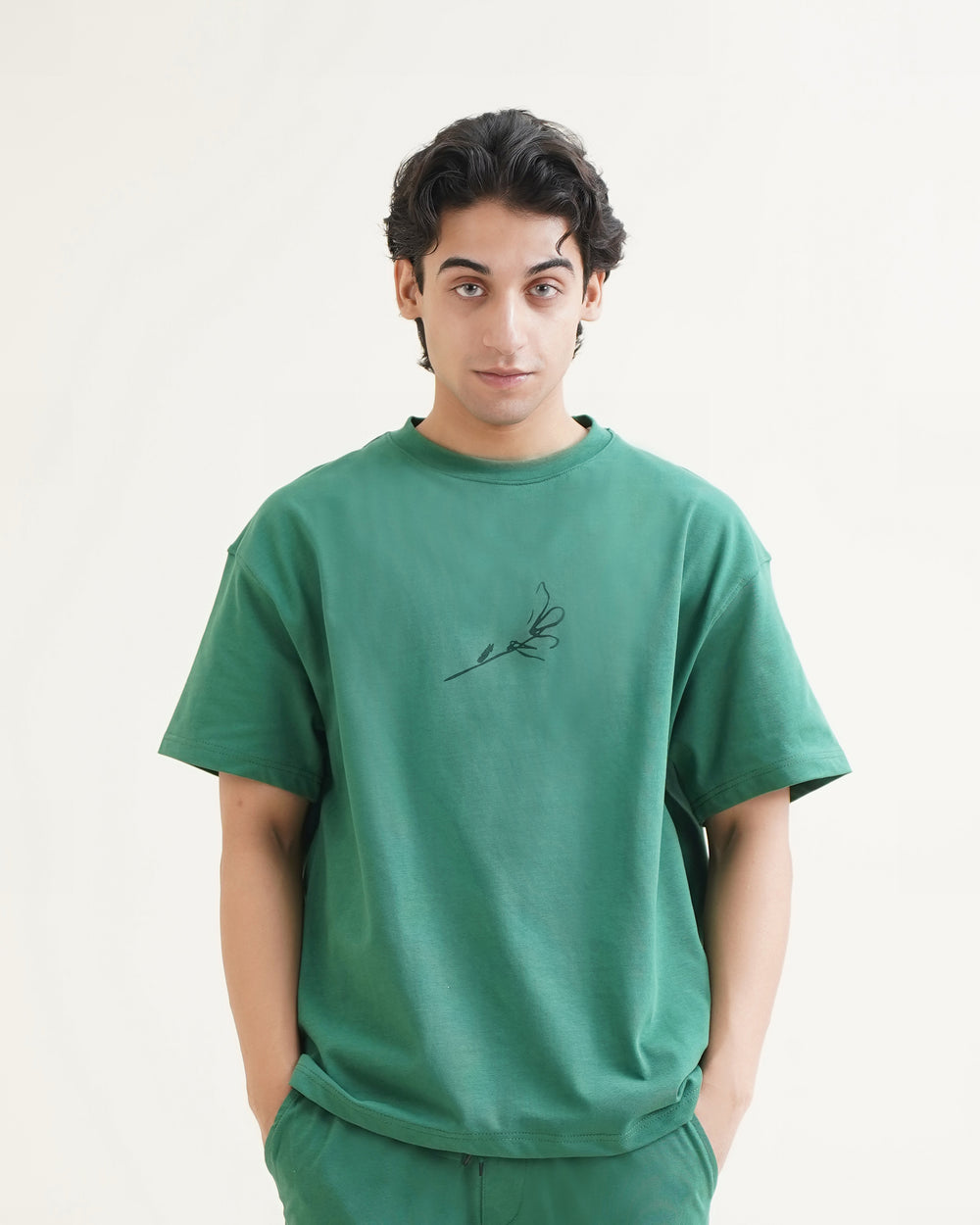 Shop the comfortable, boxy-fit deep green shorts and tee co-ord set featuring unique black floral line art. Perfect for summer in Pakistan. |