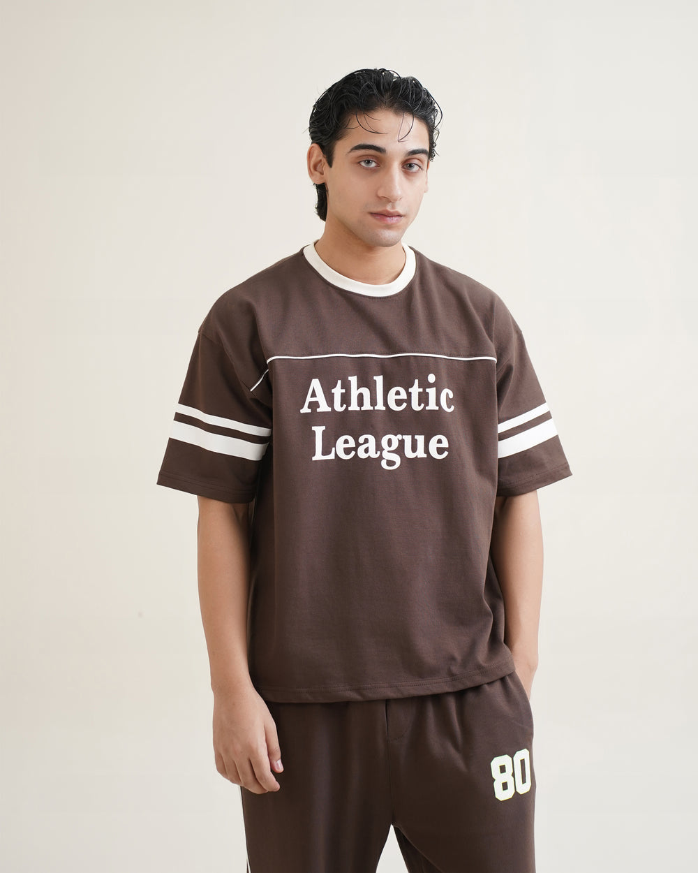 The top features a bold "Athletic League" graphic and contrast stripe detailing on the sleeves, echoing a retro sports aesthetic. The coordinating joggers include an elasticated waist for a custom fit and the '80' numerical detail on the back and thigh , finished with sleek side piping. Pair it with sneakers for a casual day out or slides for chill weekend vibes. A perfect blend of comfort, quality, and contemporary style.